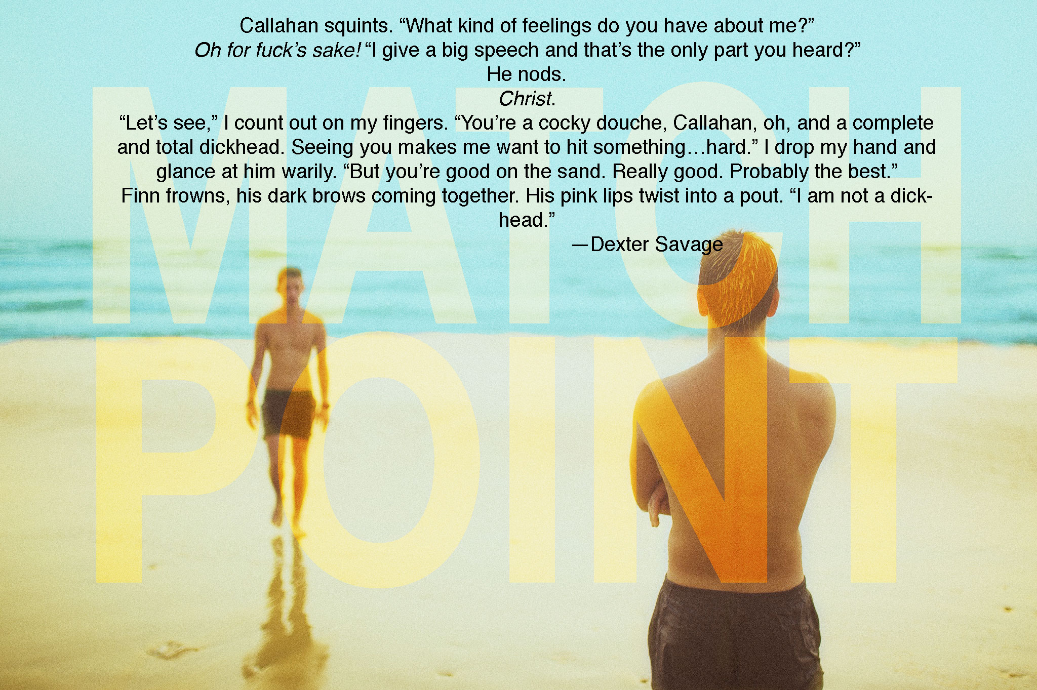 Dexter Savage is Finn’s antithesis in every way. Dex is a people person who can easily charm anyone he comes into contact with, which is a great attribute to have as a professional beach volleyball player because it gets him noticed and gives him multiple ways to bank money, which is exactly the safety net he needs, because sponsors want him to be the face for their products.