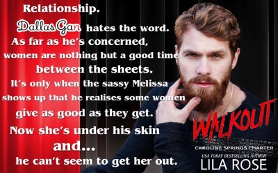 Walkout is an action packed, steamy read that takes its characters as well as its readers on one hell of a ride; it’s made clear from the very beginning of Dallas and Melissa’s story that they are “It” for one another but getting to the point they can be together is what the plot line is all about, and while it’s usually the heroine resisting the alpha biker, refusing to give in and be his, this time around, there are extenuating circumstances that keep Dallas and Melissa apart and it’s up to them to play it smart and safe, which is easier said than done for a man like Dallas and his need for the tiny woman who owns him just as much as he owns her.