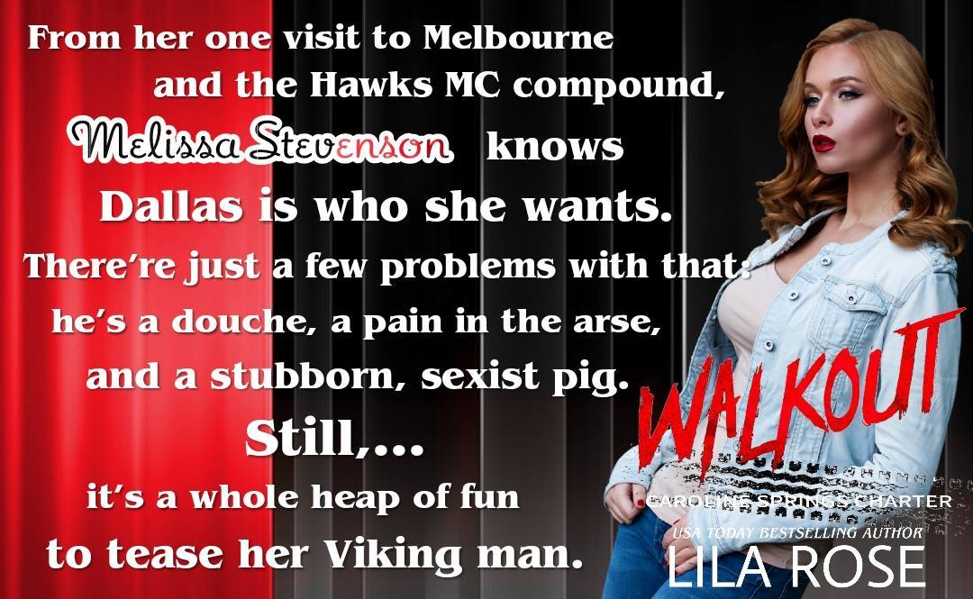 From her one visit to Melbourne and the Hawks MC compound, Melissa Evans knows Dallas is who she wants. There’re just a few problems with that: he’s a douche, a pain in the arse, and a stubborn, sexist pig. Still, it’s a whole heap of fun to tease her Viking man.