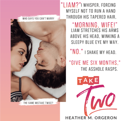 Second chance romances are definitely one of my favorite tropes, so when I read the blurb of Heather M. Orgeron’s new release, Take Two, I was all about getting Liam and Nya’s backstory and then reading about how they found themselves with an impromptu wedding and a take two when it comes to making a go as not only a newly married couple but as a family – one that was their daughter’s birthday wish.
