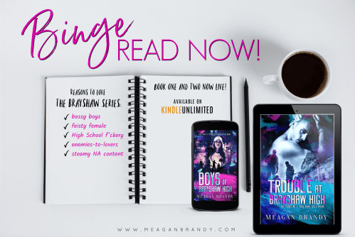 It’s going to be a struggle waiting for book three to release, but knowing where Maddoc, Cap, and Royce stand at the end of Trouble at Brayshaw High will allow me to endure until Meagan Brandy takes her readers back to Brayshaw High.