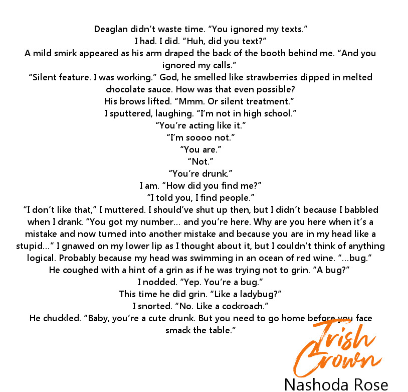 “Okay,” I croak feebly, cringing at the raspy sound. At least I can speak, even if I sound like a prepubescent boy with his nuts caught in his zipper.